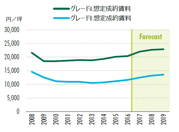 2018年以降もニーズが旺盛な状況が続くだろう。しかし、2018-19年の新規供給の年平均は5,000坪で、過去10年間(2007-2016年)の年平均3.3万坪の約15%と極端に少ない。このため、新規需要は受け皿不足で減少する見込みである。この結果、2019年末時点のオールグレードの空室率は、2017年末時点と同じ2.4%と予想する。