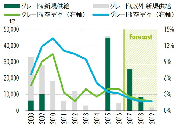 2017年は、Q1にグレードAビル2棟が竣工した。金融機関の拠点集約や、メーカーなど複数企業の立地改善を伴う移転の受け皿となった。新築ビルへ移転したテナントの移転元ビルでも、郊外からの立地改善や拡張を目的とした移転が進展。2017年は新規供給2.6万坪に対して新規需要がプラス3.2万坪と、需要が供給を上回った。その結果、2017年末時点のオールグレードの空室率は1999年Q1以来19年ぶりに3%を下回る見込み。