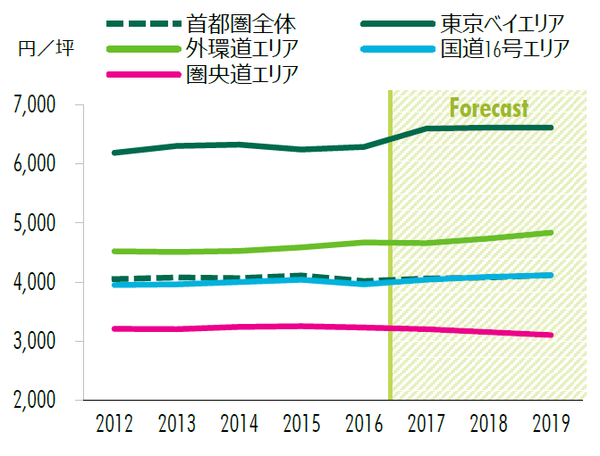 さらに、2019年には8%台まで上昇すると予想する。それでも、このエリアの実質賃料は2年間で2%程度上昇すると見込む。というのも、このエリアは幹線道路網が発達しているため配送先へのアクセス性が良く、需要が安定している。したがって、大型の供給がなされれば、集約や拡張などの需要が喚起されやすく、今後2年間の新規需要の総量は40万坪を優に超える予想である。このことが、賃料水準を下支えすることになろう。