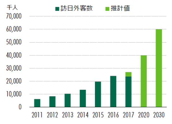 訪日外国人の消費額も、さらなる伸びが期待される。2017年の訪日外国人数は1月から10月までで前年同期比18%増の2,011万人。通年では、昨年2016年の2403万9千人を16%以上上回って2,800万人を超える可能性がある(11月末時点)。2017年7-9月期の訪日外国人消費額(速報)は前年同期比26.7%増の1兆2305億円で過去最高を記録。