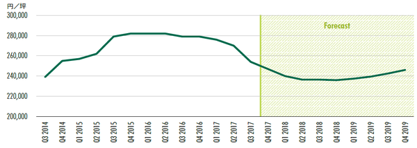 2018年Q4に上昇に転じた後は、2020年の東京オリンピックを見据えた出店ニーズがさらに高まるとみられるため、賃料は2019年末まで上昇傾向が続くと予測する。