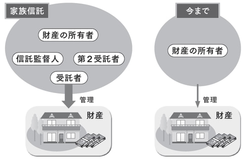 家族信託によって財産の名義人(委託者)から管理処分を託された、名義人以外の家族(受託者)が直接、財産の管理処分をするようになります。