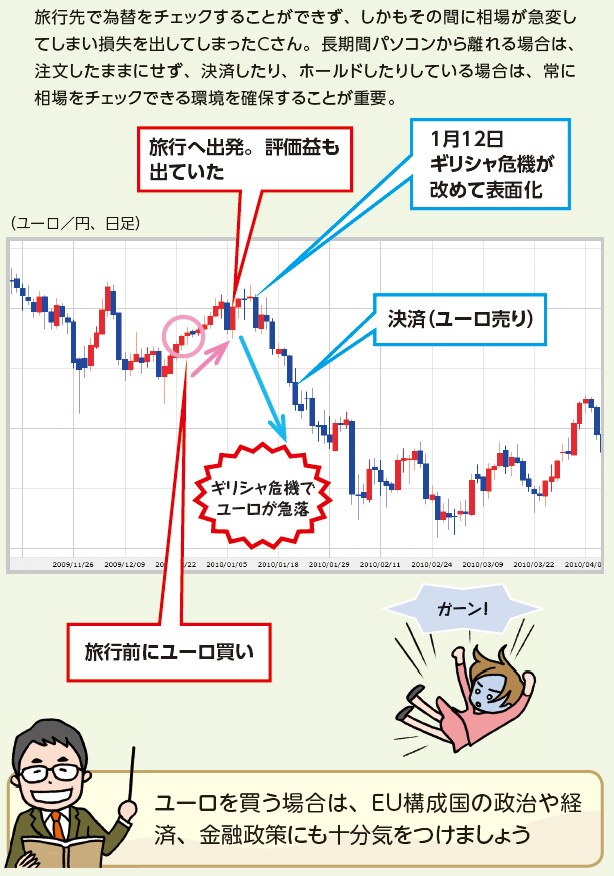 旅行中の1月12日、ギリシャ危機でギリシャ国債の格付けが引き下げられたと報じられました。その影響によってユーロは下落。Cさんは、ユーロが下落したことをニュースで知って、慌てて売り決済しました。