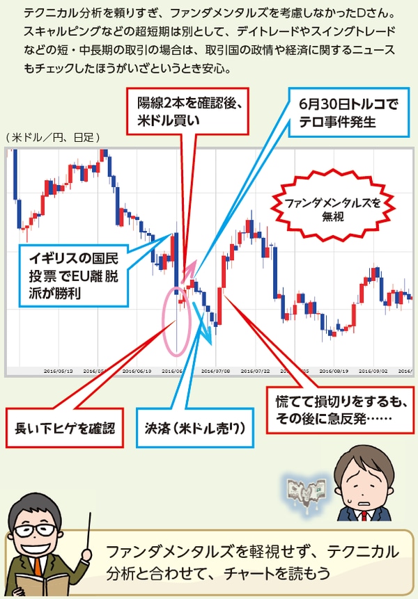 実はこのときDさんはニュースを見ておらず知らなかったのですが、トルコでテロ事件があったり、イギリスのEU離脱問題があったりしたため、ファンダメンタルズ的要因で思惑通りに為替が推移しなかったのです。