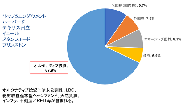 米国トップ5のエンダウメントの各運用資産の平均投資比率は、それぞれ、株式25%、債券7%、オルタナティブ投資68%となっています。株式/債券はいいとして、オルタナティブ投資への比率が高いため、このままのポートフォリオを個人投資家が運用するのは少々手に余ると思います。
