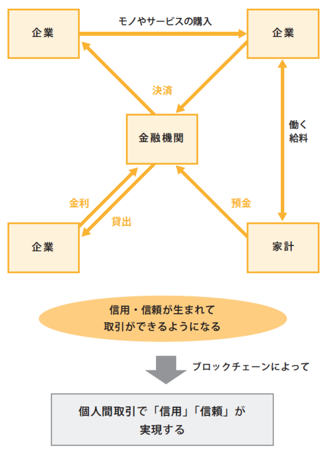 これまでの金融は、金融機関などの法人が主体となり、その信用力でサービスが提供されています。しかし、これからは法人が中央集権的に運用するのではなく、個人間でサービスのやり取りができるようになります。