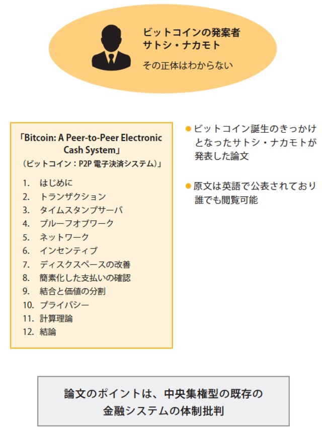 この論文で、中央集権型金融システムに異議を唱え、利用者同士が仲介する者を不要として取引できるP2P(Peer to Peer;対等の者同士が通信を行うこと)による電子決済システム、つまりは中央集権型ではなく分散型の通貨のしくみへの移行を提唱しました。これが、ブロックチェーンのもととなるアイディアです。