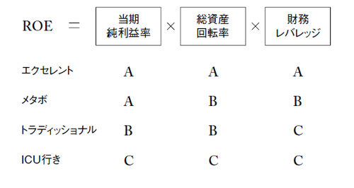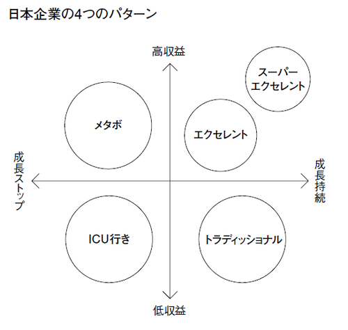 ROE(当期純利益率×総資産回転率×財務レバレッジ)の優良度と、成長性の視点で日本企業を大きく4つに分類したものが、以下の図である。すべて筆者の造語だが、それぞれを「エクセレント」「メタボ」「トラディッショナル」「ICU行き」と命名している。