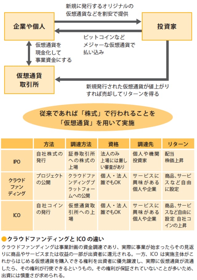 こうしたIPOやクラウドファンディングと同様の手法をブロックチェーンや仮想通貨のしくみで実現し注目を集めているのがICOです。