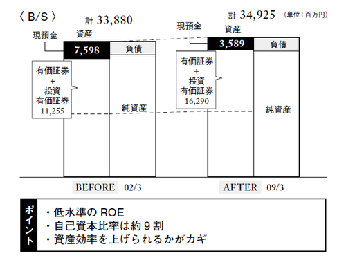 ただ、収益力が上がったとはいっても、貸借対照表(B/S)の構成が劇的に変わったわけではない。B/Sに大おおなた鉈を振るうことなく、収益の改善が実現できてしまったために、まだまだ改善の余地は十分にある。商取引への影響は考慮しなければならないが、持ち合い株だけで70億円弱(総資産の2割)はやはり大きすぎる。今後の課題は、このあたりにメスが入れられるかどうかだろう。