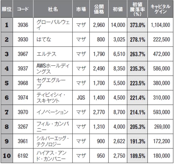 実際に、初値騰落率トップ10とキャピタルゲイントップ10を比べてみると、必ずしも騰落率が高い銘柄が上位にきているわけではありません。例えば初値騰落率で第2位のはてな(3930・マザーズ)は、キャピタルゲイン額の順位では16位でトップ10から外れています。