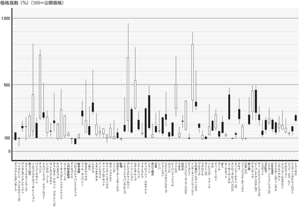公開価格で買って、初値で売ることで儲けを得ることについては前回で述べましたが、もし初値で売らないとどうなるのか、についても解説していきます。下の図表2に一代足(いちだいあし)とよばれるローソク足のチャートを掲載しました。グラフは先物のチャートで使われる一代足の考え方に基づいており、個々の銘柄の公開価格を100として、上場以降の値動きを指数化しています。