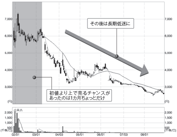 下に、同社の上場後の日足チャートを掲載します。これを見ると、上場して1カ月ちょっとで、高値から初値の半分の水準にまで下落しています。その後、少しは株価が戻る局面もありましたが、長期低迷に入って回復の兆しが見えなくなってしまいました。