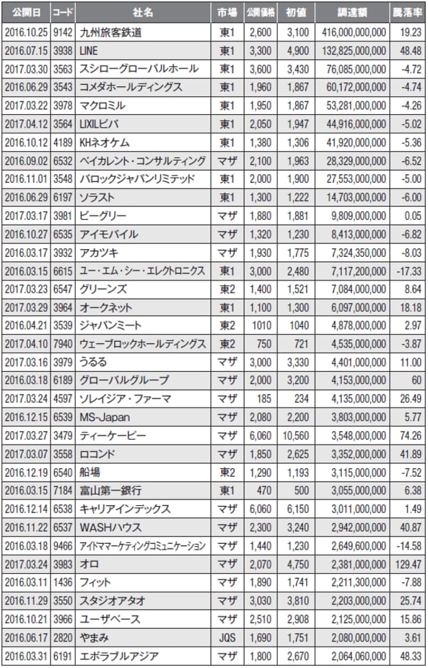 2016年の最大の調達額は、JR九州の4160億円でした。公開価格2600円に対して、初値は3100円で初値騰落率は19.23%。2番目はLINE(3938・東1)の1328億円で、公開価格3300円に対して、初値は4900円で初値騰落率は48.48%。この2銘柄を見ている限りにおいては、調達額が大きいことが初値に不利に働くようには見えません。