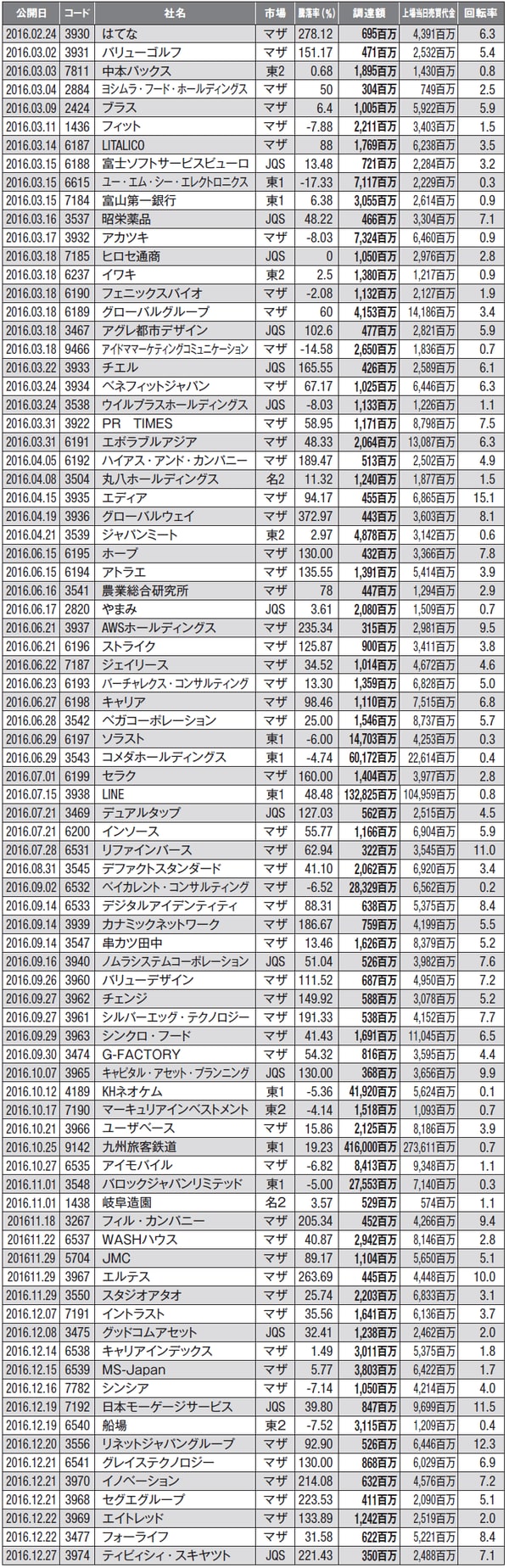 [図表]2016年IPO株の上場当日の売買代金・調達額・回転率