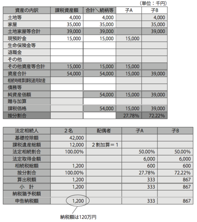 一次相続の相続税(514万8000円)と二次相続の相続税(120万円)をあわせると合計で634万8000円になります。