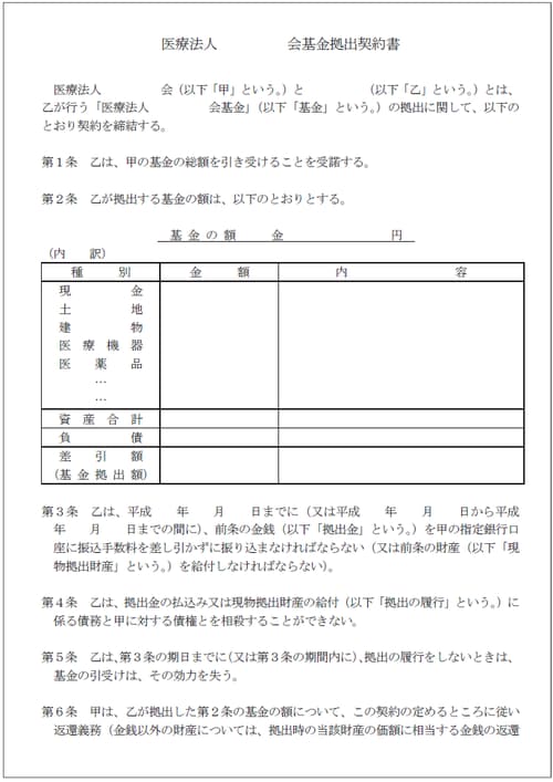 基金の拠出者が理事長以外にいない場合、つまり理事長が全額拠出する場合は、「基金拠出契約書」のみで済むとしている自治体がほとんどです。