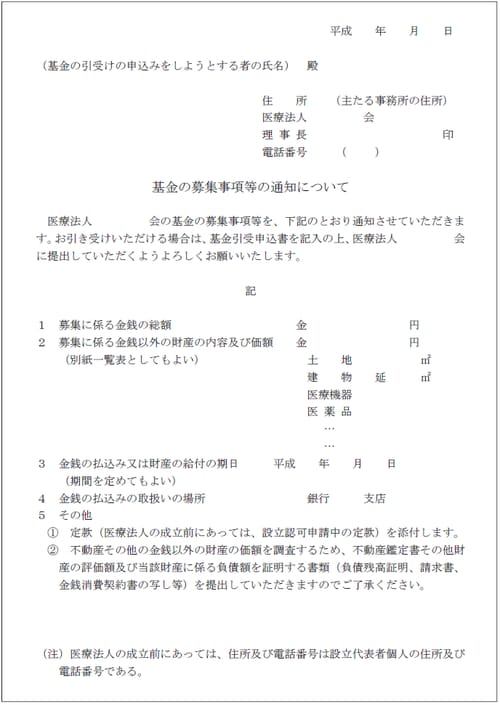 一方、拠出者が複数いる場合は、①医療法人から基金引受申込者に基金の募集事項等を通知する、②基金引受申込者から医療法人に引受申込書を交付する、③医療法人から基金引受申込者に割当決定額を通知する、④基金拠出契約書を交わすという順番で手続きを進めます。