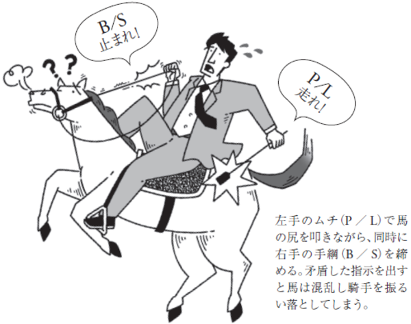 これは、「P/Lで走れ、B/Sで止まれ」と矛盾した経営の舵取りをしているようなものである。乗馬に例えるとわかりやすい。騎手(経営者)が馬(経営)に乗り、左手のムチ(P/L)で思いきり馬の尻を叩きながら、同時に右手の手綱(B/S)を力いっぱいに締める。馬は走っていいのか止まっていいのかわからず、「ひひぃ〜ん!」といななき、支離滅裂な指示を出す騎手(経営者)を振るい落とすだろう。