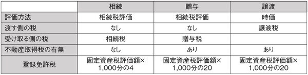 [図表]は、相続、贈与、譲渡(売買)のときにかかる税の比較です。相続の場合は不動産取得税はかかりませんが、贈与、譲渡(売買)のときはかかります。不動産の登記を行う際の登録免許税の税率も変わります。これだけを見ると、相続、贈与、譲渡(売買)のなかで相続が有利に見えますが、ケースバイケースで贈与、譲渡(売買)が有利な場合があります。