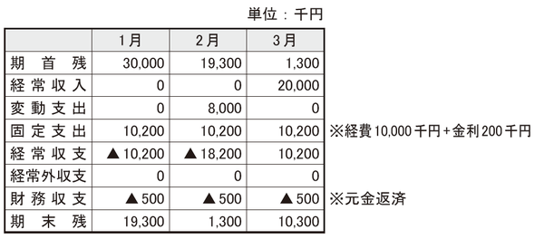 2月は,材料の仕入支払い8,000千円があり,また先月同様に固定支出が10,200千円あり,入金がないため経常収支は▲18,200千円と大幅なキャッシュアウトになります。財務収支▲500千円も勘案すると,2月末の資金残は1,300千円となってしまいました。資金残は僅少であり,翌月の期中の経費支払いに支障が出ることが予想されます。