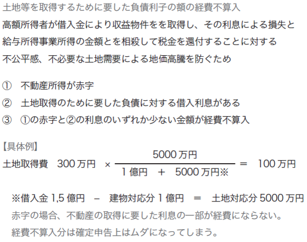 ところが赤字となると個人の場合、そうはいかない。銀行から借りたおカネのうち土地を買うのにつかった分にかかる利息と赤字の金額とのいずれか少ない金額が経費にならないのだ。