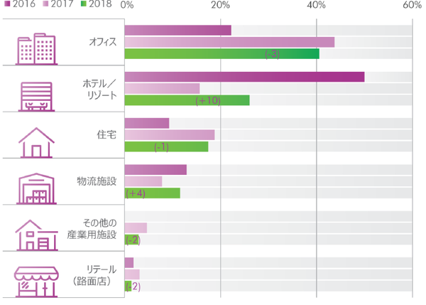 [図表1]アジア太平洋地域でもっとも魅力的なアセットタイプ(数値は2017年からの変動%point)