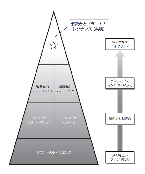 ピラミッドの頂点が「レゾナンス=共鳴」です。顧客がそのブランドの考え方に「共鳴」している状態こそ、理想的な状態であると位置づけています。