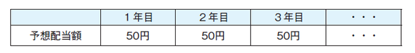 例えば、配当が毎年50円ずつ支払われるとすると、次の表のようになります。
