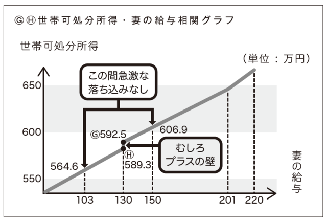 このグラフでは、妻の給与が130万円の時点で、嬉しいことに3.2万円(592.5万円︱589.3万円)世帯可処分所得が増加しています。