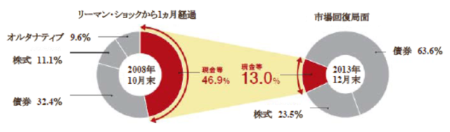 この運用戦略は、大胆に資産配分を変更する可能性をもった戦略です。下図のようにリーマン・ショック前後の期間、現金等への資産配分を比較的高めに保ち、その後は徐々に引下げた運用を行いました。
