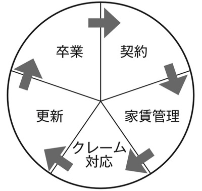 の一連の流れ、これが「契約」です。そこから、「家賃管理」、毎月の家賃の支払いです。「クレーム対応」、日々のクレームに対応します。そして「更新」です。もしくは定期借家契約であれば再契約です。最後に「退去」です。私は「退去」のことを「卒業」と呼んでいます。これらの5つの要素を落とし込むことが、「ライフサイクル」になるのです。
