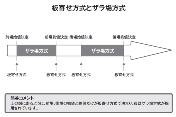 まず、板寄せ方式について簡単にいうと、前場が始まる9時(寄り付き)、前場が終わる11時半(引け)、後場が始まる12時半(後場寄り付き)、後場が終了する15時(大引け)の株価を決めるとき、主に用いられている方式です。