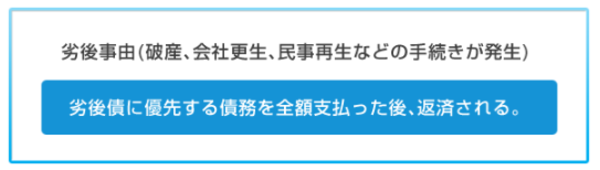 企業が倒産するなどの「劣後事由」が発生した場合の残余資産の分配において、優先債務の全てが弁済されるまで当該債券に対する分配が行われない仕組みとなっています。その分、普通の社債よりも利率は高く設定されます。