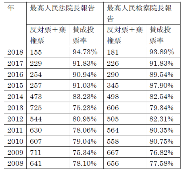 「両高」と呼ばれる最高人民法院長と人民検察院長の活動報告の表決では、近年、賛成票が増えていると言われるが、なお反対と棄権が合わせて5〜10%(図表2)、2003年、胡錦濤氏が初めて国家主席に選出された際は反対4票、棄権3票、08年再選時は反対3票、棄権5票、また03年江沢民氏が中央軍事委主席に留任した際は反対98票、棄権122票だった。