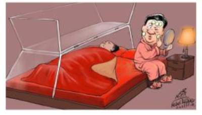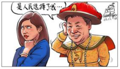 習近平主席をかつて1915年に帝政を復活させ、1916年自ら皇帝に即位した袁世凱になぞらえ、「袁二」と呼ぶ声もあり(「二」には俗語で「愚か、邪悪、横暴」といった意味もある)、袁世凱、次いで鄧小平、江沢民、胡錦濤の各氏を順番に配置し、一番右に一段と大きく描かれた習氏が逆を向いて「戻れ」と指示している様(図表1-1)、「是人民选择了我(人民が私を選んだ)」と言って嬉しそうにしている習氏の横で女性が? と白けた顔をしている風刺(図表1-2)。これは、全人代記者会見で、「全美電視台(全米TV)」と称するメディアの女性記者が長々と「我国(中国)は、、」と言いつつ、中国を持ち上げた質問をしたことに、上海第一財経の青い服を着た女性記者が「白眼」をむいて白けた表情をした映像が大きな話題になったことを材料にしたものだ。