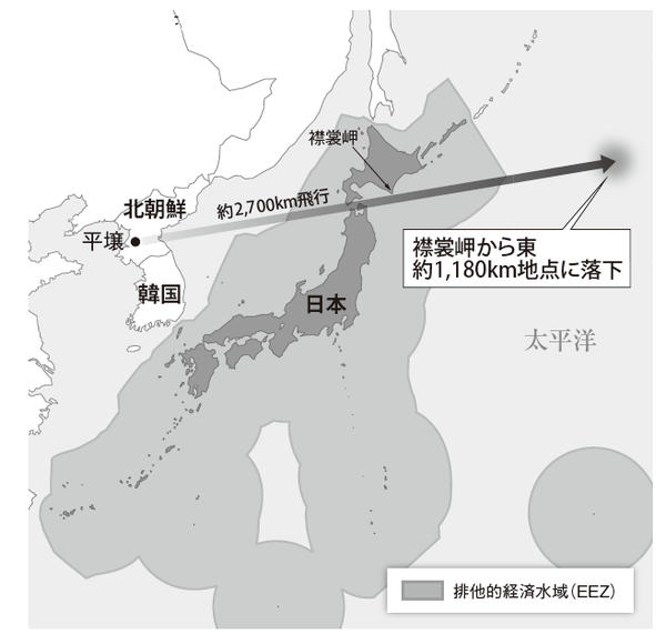 日本政府の発表によると、このミサイルの飛行距離は約2700キロメートルである。これは、いつでもアメリカ領グアムに撃ち込めることを意味する。つまり、日米両国にとって、これまでのケースと比べはるかに大きな脅威を与えたのである。