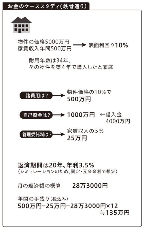 諸費用が物件価格の10%で、500万円。自己資金としては1000万円を用意しました。借入金は4000万円です。返済期間は20年で、年利3.5%です。それで運用すると、管理委託料は家賃収入の5%かかるとして、税引き前の手残りは年間100万円強になります。結果としては、地主が相続対策で取り組む以外には、あまり儲けになる投資とはいえません。