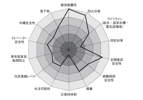 防災対策チェック結果の例自分たちのマンションがどのような安全性を確保できているかを知ることは、マンションに住む人々にとってとても大切なことと思われます。