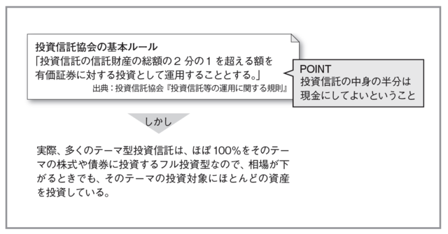「投資信託の中の株式保有比率を90%以上に保たないといけない」とルール決めしている投資信託すらあります。そうするとファンドマネージャーは相場が下がると判断したときに売却したほうがよいと考えても、売却できないことになります。このようなフル投資型の投資信託は、信じて託してはいけないのだと投資家が認識する必要があります。