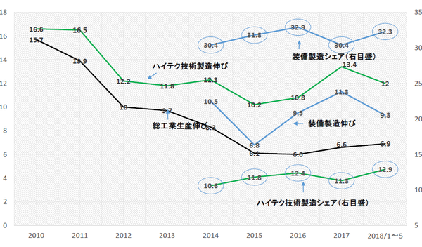 ②産業構造の高度化を見る上で、中国当局は以前からハイテク技術製造業の伸びと装備製造業伸びを重視している。国家統計局は2017年のハイテク技術製造生産3.3兆元(13.4%増)、装備製造9.1兆元(11.3%増)、また、総工業生産伸び6.6%増に対するハイテク技術製造の貢献率23%、装備製造52%と両分野が大きく伸びているとしている。