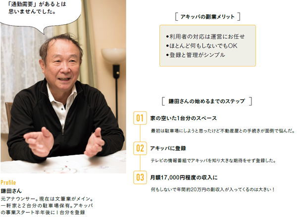 自宅の空き場所を駐車場として貸し出す「アキッパ」