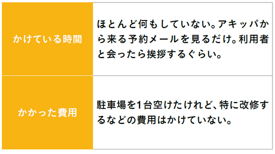 ほかにどんな工夫もしていません(笑)。ほんとうに、場所さえ空けておけばいい。広告も打たなくていい。空いている駐車場があれば今日からでも始められる副業です。あとはお金を振り込んでもらうだけ(笑)。