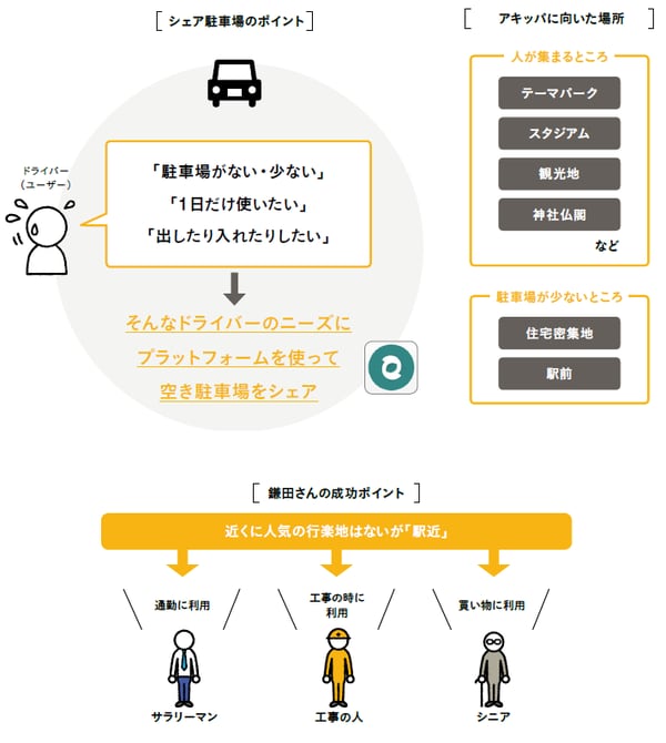 人気の大型施設やイベント会場、観光地などへ車で行ったとき、駐車場不足で止められなかったり、高い駐車料金に驚いたりした経験がある人は少なくないでしょう。アキッパは、「空いている駐車場・使わない駐車場」をシェアするサービスとして、駐車場を探す人と貸してもいい人(オーナー)をマッチングさせるサービスです。
