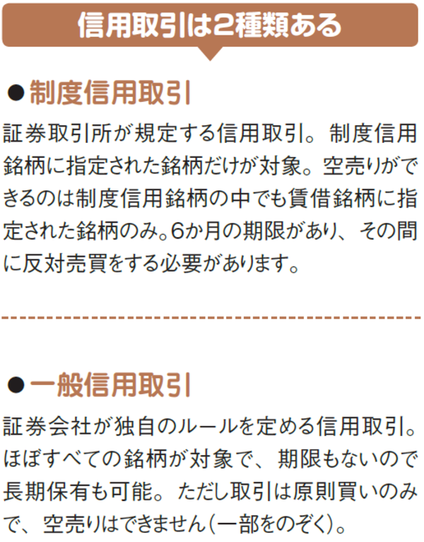 ちなみに、信用取引には6か月の期限がある「制度信用取引」と、期限のない「一般信用取引」の2種類があります。制度信用取引は6か月の期限内に反対決済をする必要があるのに対し、一般信用取引には期限がありません。ただし、一般信用取引の多くは買いからしか取引ができず、空売りができるのは一部の証券会社に限られます。