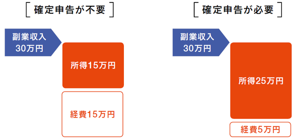 例えば、副業の収入が30万円あったとします。この収入を得るために15万円の経費がかかったとしましょう。すると所得は15万円となります。所得が20万円以下の場合、確定申告の義務はありません。しかし、5万円しか経費がかからなかったときは、所得は25万円となり確定申告が必要です。ですので、経費がかかった証拠である領収書をきちんと管理しておくことが大切になるのです。