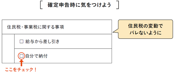 これを防ぐには、確定申告の時「給与所得以外の所得に係わる住民税」の徴収方法を「特別徴収(給与から差し引き)」ではなく「普通徴収(自分で納付)」にして、自分で住民税を支払います。この場合、会社にはまず変動がわかりません。