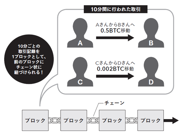 取引は10分毎にブロックというものにまとめられ、時間を経るごとに、新しいブロックが生成されていきます。また、取引は世界中で24時間行われていますので、取引の結果として残高がどう変わったか、誰がいくら持っているかといった台帳としての整合性が失われないように、ブロックを次々とつなぎます。このようにブロック同士をチェーンのようにつないでいく構造になっていることから、ブロックチェーンという名前が付いているわけです。