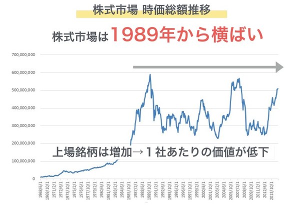 日本の株式市場は1989年をピークに、上がったり下がったりを繰り返すレンジ相場に入っています。その間にも上場銘柄は増加していますので、1社あたりの時価総額は低下していると言えます。