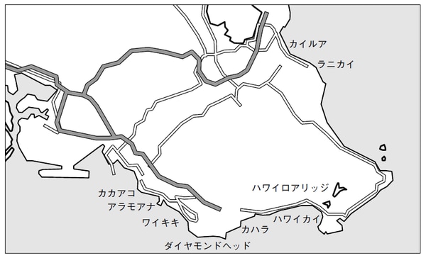 ワイキキから東へ車で約30分、ハナウマ湾に近い小高い丘にある高級住宅地です。住宅地内の道路はすべて私道。住宅地へ上がるメインストリートの入り口にはゲートがあり、警備員が住宅地への出入りをチェックしています。